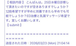 愛知県から新幹線こだまに乗って来院。治療日前日まで東京にイクのイカないの、相当に悩んでいらしゃっいましたが、最後は治療にイキたいと直接、お電話を頂きました。 行きつけの名古屋の風俗店は、巫女(みこ)かナースコール系。ナー […]