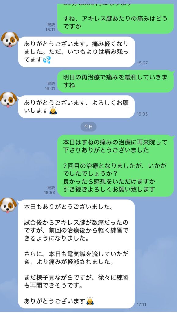 すね、アキレス腱の痛みで来院。治療後に痛みがまだ残り再治療となりました。電気針で治療しました