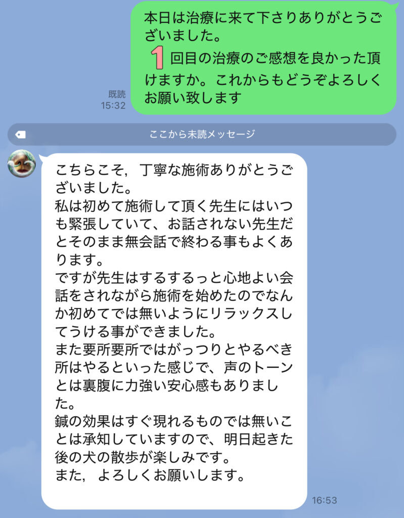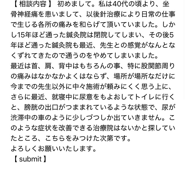 首、肩こり、背中の痛み、股関節の違和感と痛み、夜間頻尿、閉尿。男性でも早ければ30代後半から更年期症状が訪れます。不定愁訴という、これといって病気などの異常はないものの、本人が強く感じる不快症状をいいます。 その程度には個人差がありますが、首、肩こり、背中の痛み、腰痛、不眠、夜間頻尿、疲れやすいなど多岐に渡ります。治療は、90分間の鍼灸治療とアロマセラピーマッサージを組み合わせて、自律神経の調節をいたしました。白髪ポニーテールの素敵なイケオジでした
