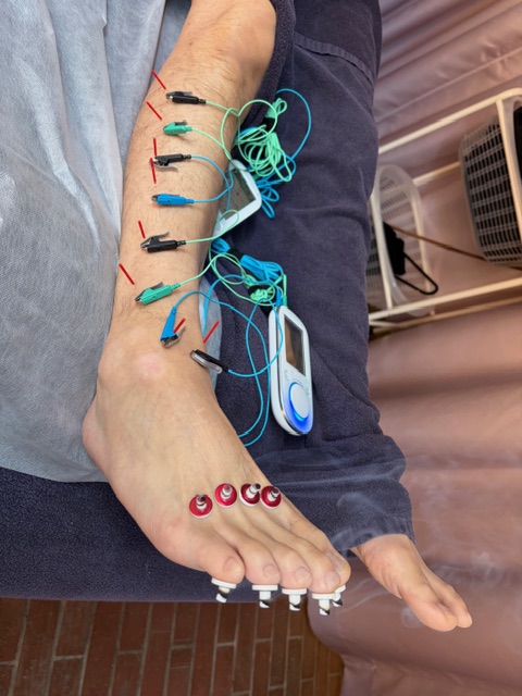 シートが近すぎるのか、それとも何か別の問題なのか不安になり来院。膝から下がガチガチになっていたので低周波電流を流して電気針、足関節の痛みと、血行が悪く凝る固まっていパンパンなすねの疼痛緩和をしました。