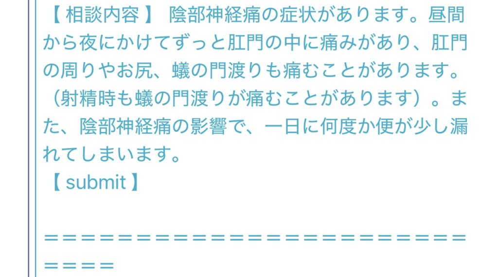 会陰や、肛門の周り、蟻の門の周りの痛みに関与する神経は、①骨盤神経(勃起神経とも呼ばれる)②下腹神経 ③陰部神経です。当治療院では、このような症状に対しては勃起神経、陰部神経の両方を治療します
