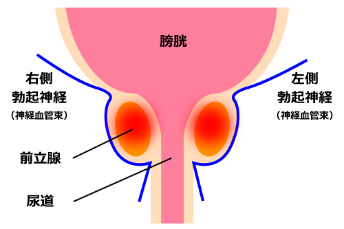 勃起神経は前立腺を取り囲んでいます、そのため、前立腺に電気針をすると勃起神経にまで効果が派生します。治療院では会陰式で、前立腺に向けて刺鍼して電気を流しています