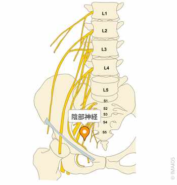 陰部神経はお尻の仙骨にある仙骨孔の穴から長い鍼を通して陰部神経に刺鍼して電気を流します