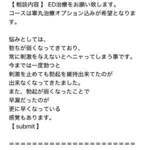 ED治療 168㎝ 82㌔ 48歳 たちが悪い、長続きしない、角度も下がっている、射精の勢いがない新着!!