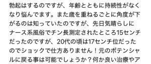 陰茎の根元に電気針を入れて睾丸が震えるくらいの低周波電流を流して、陰嚢全体には超音波治療をします。患者さまからは自分でもビッ栗するくらいに ビンビンに痛いくらいに強烈に勃起しましたと感想を頂きました。症例写真は今年60歳 […]