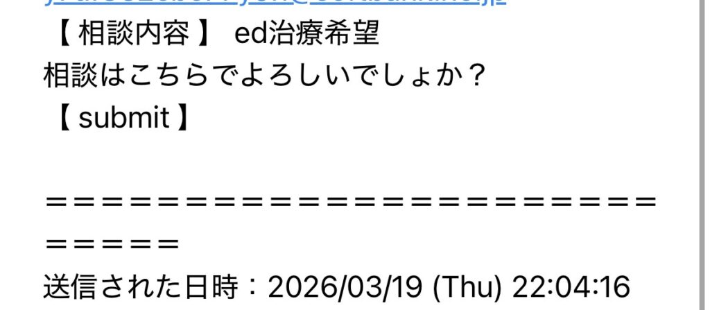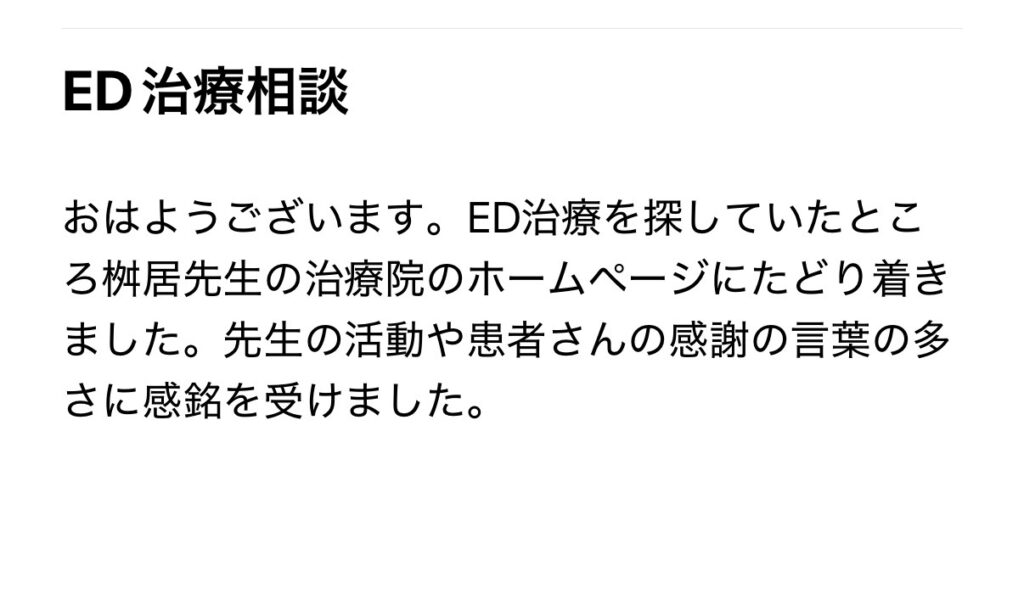 ED治療 ホームページからの問い合わせ 2026年3月20日 最終更新日時 : 2026年3月20日 masui 治療院は宣伝をしていないので、ホームページ上で、患者さんが提供してくださる症例写真が、治療院のすべてです。患者さんの症例写真が、また新しい患者さんを、北海道から沖縄まで、全国から呼んできてくれています。それぐらい症例写真にはパンチがあり、説得力があります。私にED治療を任せてくれた患者さんには本当に感謝しています。今年の6月で5年目を迎えます、私を支えてくれている患者さんひとりひとりに、心からありがとうって言いたいです。 Screenshot Screenshot \ 最新情報をチェック / Page Views 15 FacebookXBlueskyHatenaCopy