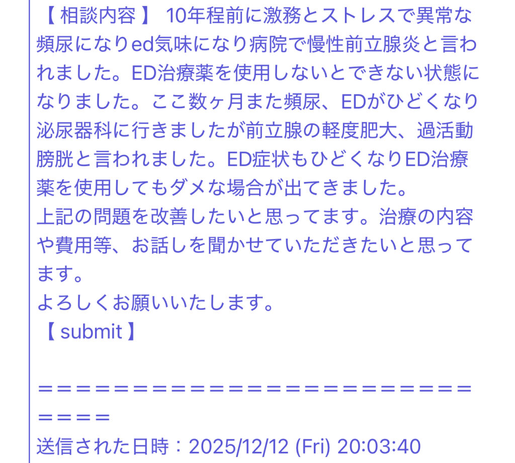 ED治療 前立腺肥大症 前立腺電気針2回目 47歳 2025年12月28日 最終更新日時 : 2025年12月28日 masui 前回の前立腺針でEDも頻尿も劇的に改善した。なによりも驚いたのは枯山水のはずの亀頭が前立腺液(透明液)で潤ってきた。SEXも自信がつき夢みたいな2週間を過ごしたが、コーヒーを飲み始めたら頻尿だけが元に戻ってしまった。引き続き治療の継続を決めた 自律神経改善 かざぐるまの鍼をしました 陰毛が長い方は超音波治療の邪魔になるので、ツインテールにする時があります。 \ 最新情報をチェック / Page Views 11 FacebookXBlueskyHatenaCopy