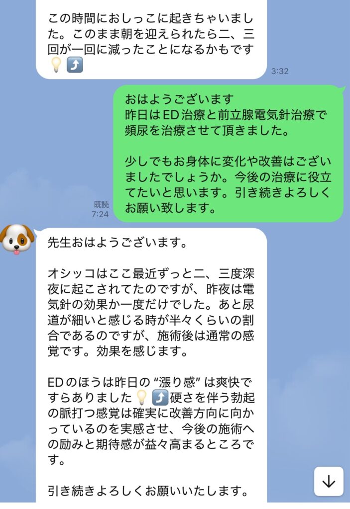 ED治療 勃起不全 夜間頻尿 会陰の灸 前立腺電気針 2025年12月29日 最終更新日時 : 2025年12月29日 masui 勃起不全と夜間頻尿に対して、会陰の灸と前立腺電気針で治療。患者さまは、オシッコの細さが気になっていましたが、治療後はオシッコの勢いも、夜間頻尿も改善されたと嬉しいラインを頂きました。 会陰の灸 前立腺電気針。 前立腺電気針と自律神経治療。背中の背骨の両側をゆるめて副交感神経の高まりを作りやすくします。 \ 最新情報をチェック / Page Views 14 FacebookXBlueskyHatenaCopy