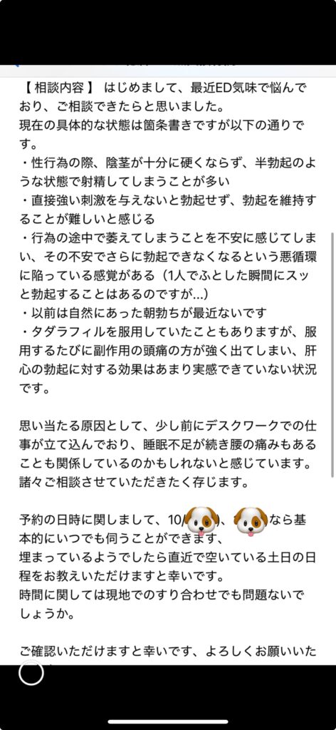 デスクワークが多く腰痛があるのと3か月前に強いストレスを感じてその後ED症状があらわれた。腰痛とEDには関係性があります。性的刺激により引き起こされた脳の興奮が脊髄を伝わり陰茎に届きますが腰痛の原因がこの通り道を障害すると脳の興奮を陰茎に充分に伝えられません。そうなるとEDになる可能性が高まります。長時間のデスクワークも鼠径部や会陰部を圧迫して血流悪化や神経障害などを起こすこともあります。今回はストレス緩和も考慮して全身のアロマセラピーマッサージで自律神調節をしています。アロマセラピーは、植物から抽出されたオイルを使って心身の健康を促進する自然療法です。香りは嗅覚を通じて脳に直接働きかけ、リラックス効果やストレス軽減効果が期待できます。自律神経失調症の症状を和らげるためにアロマセラピーは高い効果があります