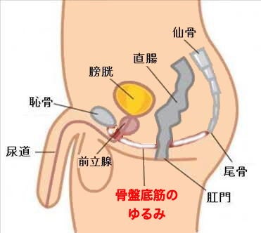 おしっこの時、排尿の最後のほうで尿を切るのに骨盤底筋を使って尿を切ります。骨盤底筋が衰えると排尿後尿滴下を生じてきます、これがいわゆる尿もれ、ちょいモレの正体です。排尿終盤に尿道に残った尿を骨盤底筋を使って切るのですが、骨盤底筋がゆるんでいるせいで、これが切れなくなり尿道に残った尿が、ズボンの中にしまった後で、ゆるゆる垂れてきて、下着やズボンを濡らしていきます