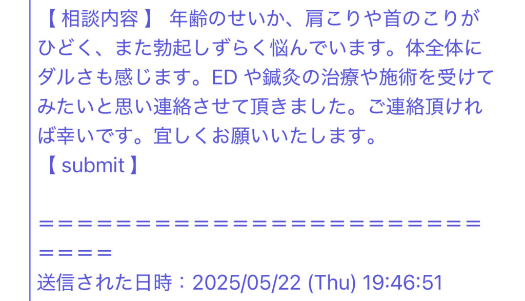 ED治療 月2回治療 7カ月経過後 2025年12月19日 最終更新日時 : 2025年12月19日 masui 初診は2025年の5月。月に2回、継続してEDと残尿感の改善の治療を受けている方です。前回は前立腺電気針を含む治療(44000円)を受けて、今回は今月2回目の治療なので会陰の灸で標準治療(33000円)を選択。結果はフル勃起になりました。継続は力なりですね。2025年5月の写真も掲載しました、比べると歴然です 2025年12月 フル勃起ですね 2025年5月初回の治療。フル勃起までもう少し。当時はこれでも本当に喜んで頂けました \ 最新情報をチェック / Page Views 8 FacebookXBlueskyHatenaCopy