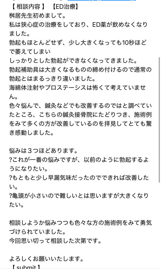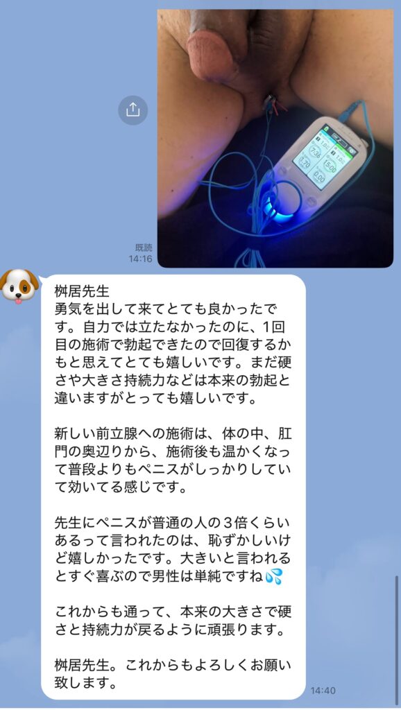 ご希望の日時のご予約が取れず変更をお願いして来院。2週間前に心臓の3本の動脈が詰まり2回に渡り手術をした。ED治療に関しては前立腺へのマッサージと電気針が当院の標準治療より高いので悩んでおられましたが、やはり治療したいとのことで前立腺電気針を希望。勃起できた事が本当に嬉しかったのか、帰り際にちょっと照れながら手を差し伸べてくださりガッチリ握手!!!