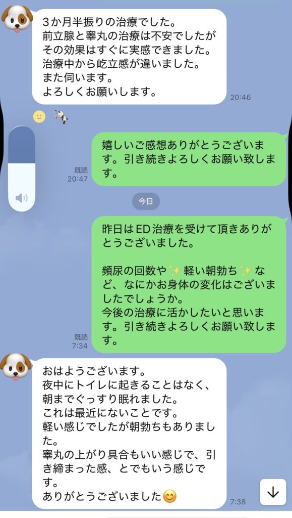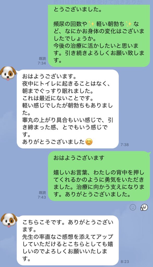 患者さんの治療に対する信頼感は、今回のように、治療効果を最大化・モンスター化のフル勃起を可能にします。患者さんの精神的な安心感を引き出すのは治療家の器量ですね。患者さんとの信頼関係が強固であるほど、患者さんは症状や不安や性癖を包み隠さず話してくれますし、結果として適切な治療計画を立てる事ができます。それが治療をより良いものにしていきます。