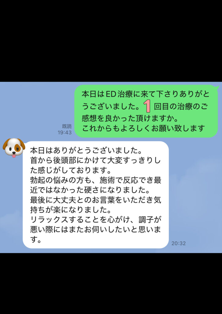 35歳 性欲減少、勃起不全、早漏、夫婦間の性交渉激減。年齢的にも若いし不安ですよね。自律神経を整えた後は精液より先に脳汁をだせるように治療。乳頭マッサージで興奮を覚えると脳から多数のホルモン=快楽物質が脳内にでます。 幸福ホルモンとして知られるドーパミン、天然の鎮痛剤として知られるエンドルフィン、愛情ホルモンとして知られるオキシトシン。 どのホルモンも脳と体に多くの点でプラスに働き総体的に勃起の質をグンと高めます。