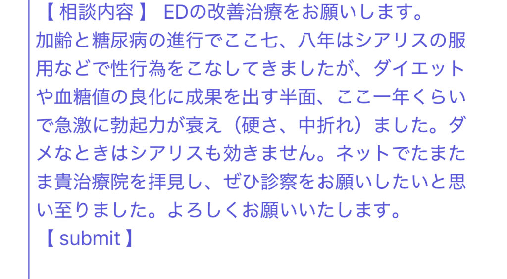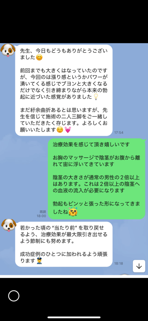 ED治療 糖尿病 HbA1c12➡6.3 58歳 2025年10月16日 最終更新日時 : 2025年10月16日 masui 糖尿病で88キロから78キロまで減量成功。勃起不全もこの勢いで治療したい。治療開始は2026年6月から月に平均すると1~2回の治療。徐々に患者さんご本人が勃起していると感じるくらい治療成果がでてきています ★9月中旬から予約受付を中止していましたが、10月より少しづつですが予約を再開しています。どうぞよろしくお願い致します。 \ 最新情報をチェック / Page Views 32 FacebookXBlueskyHatenaCopy