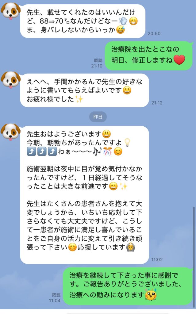 ED治療 糖尿病 HbA1c12➡6.3 58歳 2025年10月16日 最終更新日時 : 2025年10月19日 masui 糖尿病で88キロから78キロまで減量成功。勃起不全もこの勢いで治療したい。治療開始は2026年6月から月に平均すると1~2回の治療。徐々に患者さんご本人が勃起していると感じるくらい治療成果がでてきています ★9月中旬から予約受付を中止していましたが、10月より少しづつですが予約を再開しています。どうぞよろしくお願い致します。 \ 最新情報をチェック / Page Views 410 FacebookXBlueskyHatenaCopy