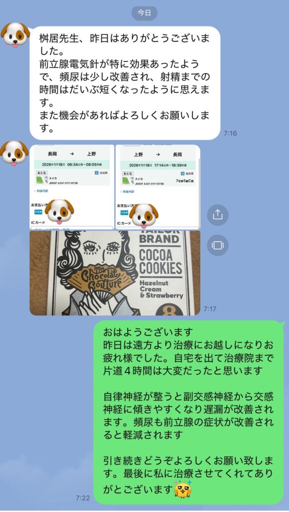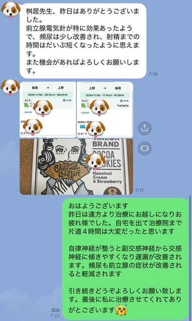新潟県にある自宅から長岡の駅に到着し、それから六本木の治療院までの片道は4時間だったとお聞きして大変恐縮しました。今回の遅漏治療にわたしを選んでくださってありがとう。治療は前立腺液が溢れて射精感を身体で感じてもらったところで終了です。(射精できません)