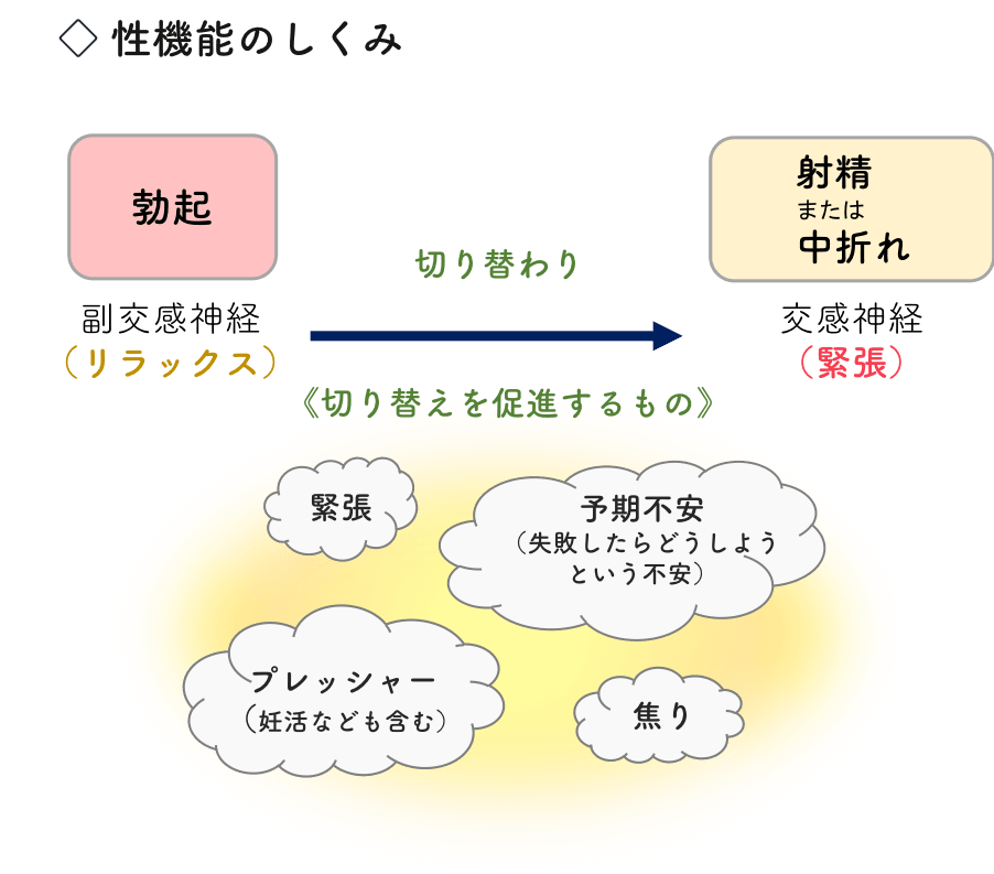 勃起はリラックスする時の神経である副交感神経によって支配されています。なので、身体がリラックスできないと充分な勃起状態を維持できません。射精は性的な興奮が最大になると、副交感神経優勢から交感神経優勢に自動的に切り替わります。これが中折れになってしまう時は、射精に到達する前に、交感神経に切り替わってしまい、そのまま陰茎が萎えてしまった。逆に射精できても、切り替わりが早すぎると、早漏になって意図せず終わってしまうこともあります