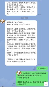 43歳、2年前から勃起不全。メジャーなED薬、シリアス、レトビア、バイアグラはすべて試したが最近では効果が感じられない。不眠もあり自分の中では自律神経の乱れだと自覚。勃起できるならすべてやりたい。前立腺への電気針も施術。治療終了時には満面の笑顔でお帰り頂きました。