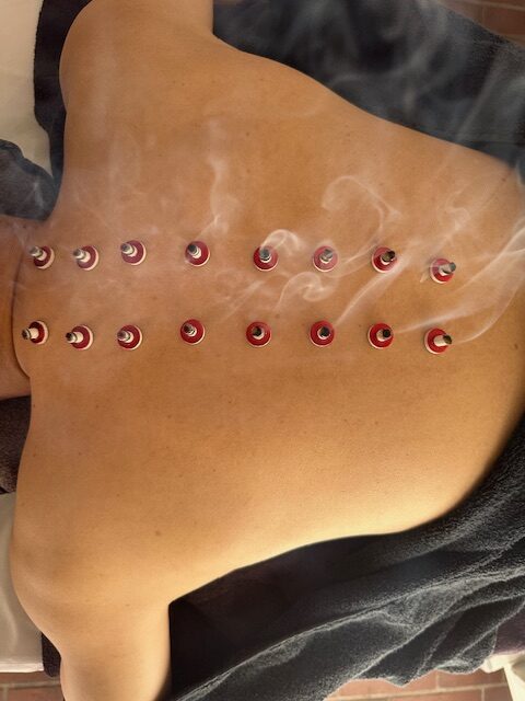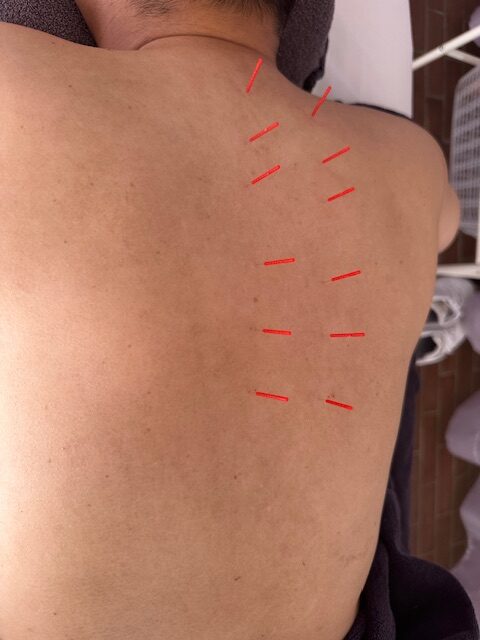 お腹が張ってました。交感神経優位です。鍼は深度と角度に気をつけて刺します