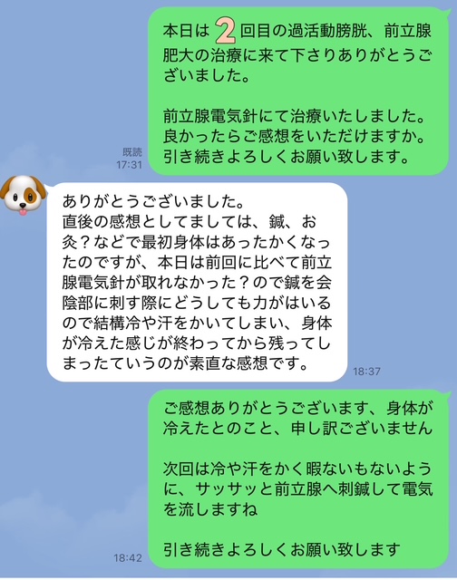 泌尿器科で過活動膀胱+前立腺肥大の診断をされた患者さんで2回目の治療です。切迫性の尿意がある患者さんなので尿もれパットをつけていらっしゃいます。前立腺電気針希望で来院。前立腺はクルミ大の大きさなので2回ほど角度と位置を変えて刺鍼して電気を流しています。