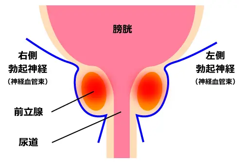 勃起神経:別名は骨盤内臓神経とも言い、自律神経の一つで、陰茎の怒張(フル勃起)に強く関連しています。勃起神経は前立腺のまわりを走行しています。なので当院の前立腺電気針をすると勃起神経にも刺激が伝わります。