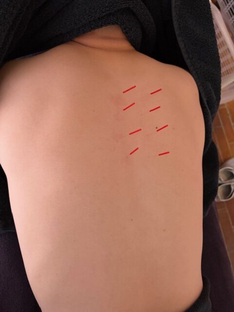 陰茎・睾丸への低周波電気針 睾丸が震える程度の電流を流します