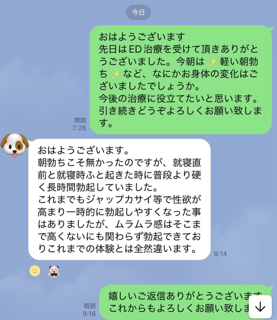 ED治療 朝勃ち 32歳 2026年1月8日 最終更新日時 : 2026年1月8日 masui 治療後の朝勃ちの報告です。嬉しいご報告ありがとうございます。 \ 最新情報をチェック / Page Views 99 FacebookXBlueskyHatenaCopy